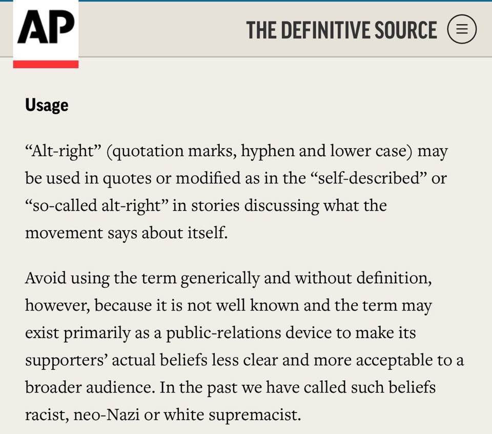 On November 28, the Associated Press came out with bold guidance for how responsible journalists should use—or not use—the term, recommending that it be put in quotes or paired with “so-called” or “self-described,” and specifying: “Whenever ‘alt-right’ is used in a story, be sure to include a definition: ‘an offshoot of conservatism mixing racism, white nationalism and populism,’ or, more simply, ‘a white nationalist movement.'”