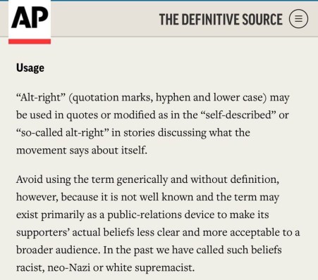 Let’s avoid using ‘alt-right’ in isolation, without an explanation (which means it will rarely be appropriate in headlines). … It’s a racist, far-right fringe movement that embraces an ideology of white nationalism and is anti-immigrant, anti-Semitic and anti-feminist.